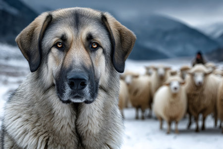 Shepherd dog intently watching, guarding a herd of sheep in a snowy mountain landscape