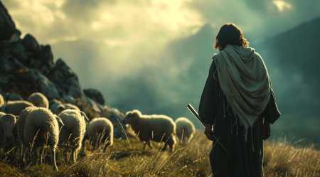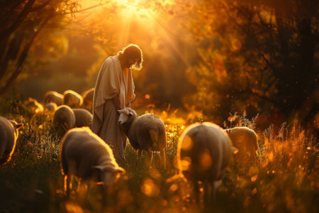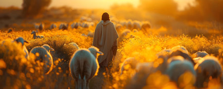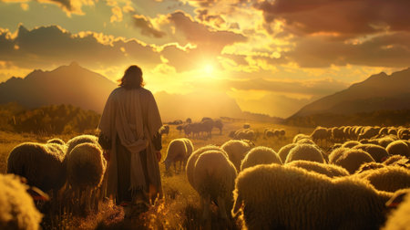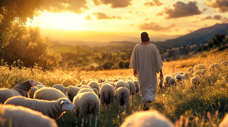 In a picturesque valley, Jesus walks amidst a flock of sheep, bathed in the warm glow of the setting sun, embodying tranquility and connection with nature.