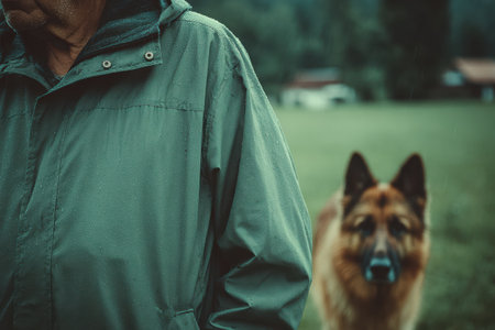 Man wearing a raincoat stands outdoors in a green field with a German shepherd dog nearby, creating a serene and natural atmosphere.