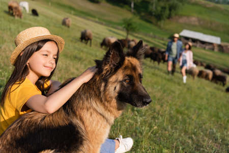 happy girl in straw hat petting cattle dog near blurred parents in green meadow