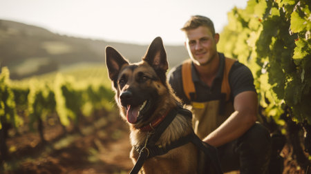 Vineyard training session dog trainer instructs guard dog among grape rows