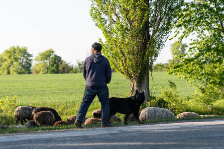 Ukraine, Bacota, 11.05.2020: Shepherd with black big dog and flock of sheep in the meadow
