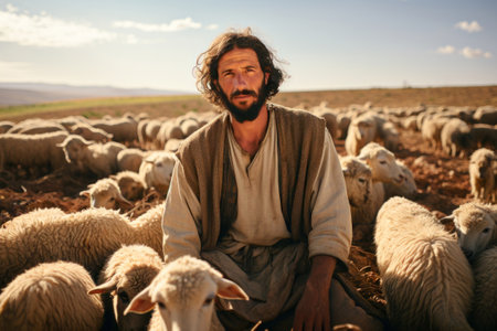 Jesus Christ standing among a flock of sheep, biblical religious scene. Perfect for themes of faith, Christianity, and spiritual storytelling.