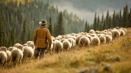 A shepherd, draped in traditional attire, guides a flock of sheep through a rugged mountain landscape, exuding a sense of leadership, tradition, and pastoral life.
