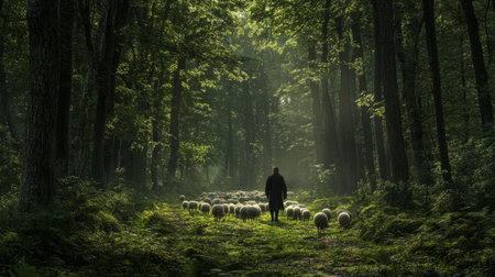 Shepherd walking in a forest clearing, sheep grouped around generative ai