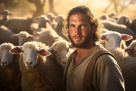 A shepherd from Jerusalem herding and taking care of his flock sheep in a field in the nature Generative AI Illustration.