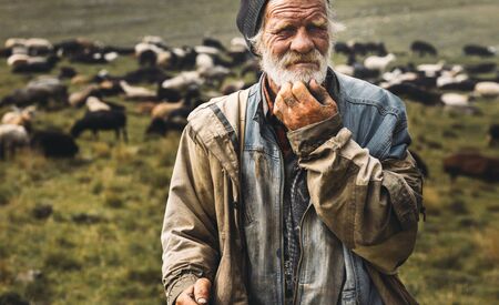 Male old shepherd is looking at camera on herd background. Farmer Professional Portrait Concept