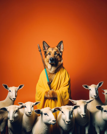 An AI generated illustration of a Shepherd dog in a flock of sheep on an orange background