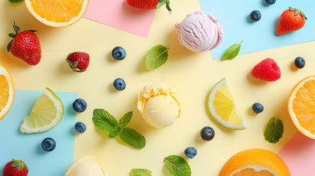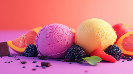 Set of colorful ice cream scoops with fruits and chocolate, creating a delightful dessert scene.