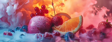 A dynamic composition of frozen fruits including oranges, berries, and grapes, surrounded by colorful swirling smoke. The vibrant colors and frozen textures create an intriguing and artistic scene.