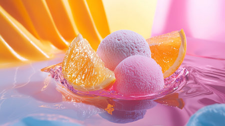 Two pink scoops of ice cream paired with fresh orange slices, arranged on a colorful, vibrant background that highlights the sweetness and refreshing appeal of the dessert.