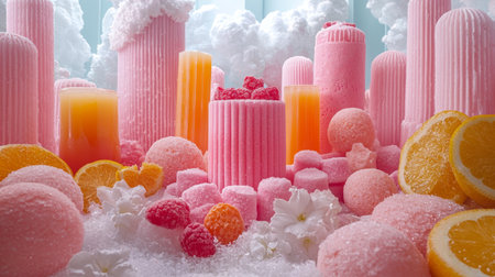 Pastel-colored ice cream scoops placed in decorative cups with strawberries, set against a soft pink background, creating a playful and sweet aesthetic with a focus on the vibrant colors and textures.