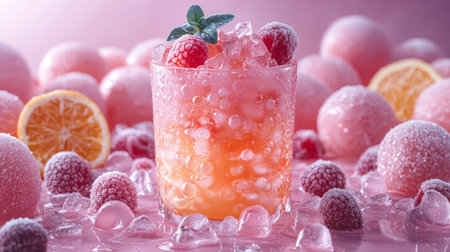 A vibrant orange cocktail garnished with fresh raspberries, mint leaves, and ice cubes, served in a glass against a pastel background.