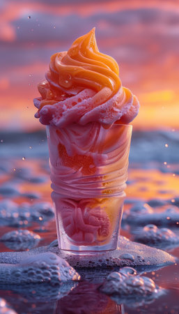 Discover the perfect harmony of seaside serenity and tempting indulgence as a luscious sorbet swirl in a crystal glass captivates amidst the peaceful minimalism of a sunny beach