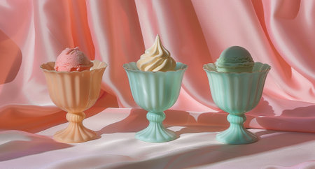 Classic ice cream scoops in peach cream and mint hues served in pastel goblets against a silky draped backdrop.