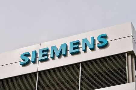 Zug, Switzerland - 26th February 2021 : Siemens company sign hanging on a building facade in Zug, Switzerland. Siemens AG is a international and one of the largest engineering company in europe