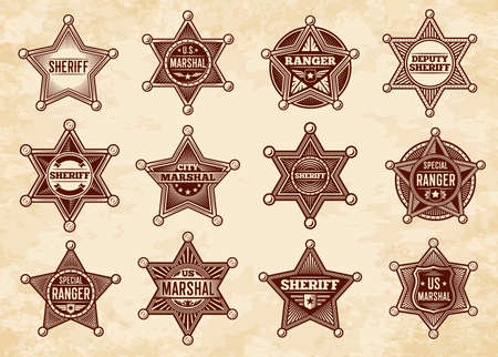 Sheriff, marshal and ranger stars, vector badges. Wild West Us police vintage insignias. Graphic design elements, american lawman signs on paper texture background, five or six pointed stars set