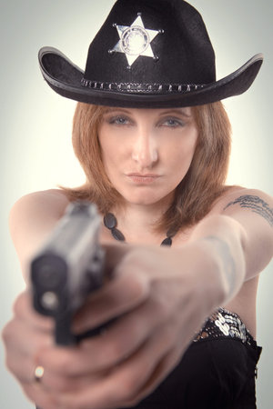 girl with tattoos sheriff policeman in the studio.