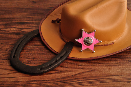 Cowboy hat with Sheriff badge on wooden background in horizontal format with selective focus