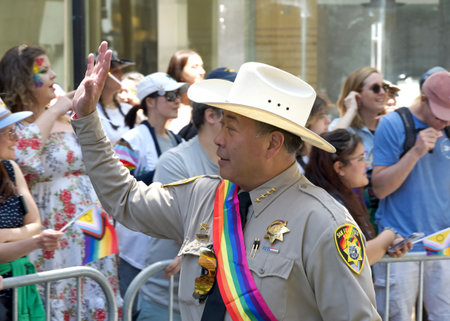 San Francisco, CA - June 30, 2024: Sheriff Miyamoto participating in the 54th annual Gay Pride Parade going up Market. This years theme, Beacon of Love.