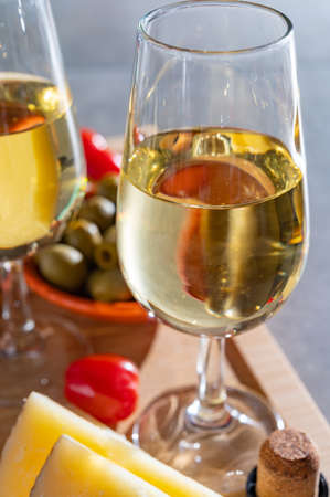 Glasses of dry cold fino sherry wine served with spanish tapas, manchego cheese, green olives, cheese crackers