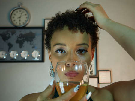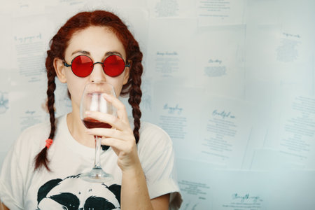 Cheerful woman in round red goggles with funny pigtails drinks wine. Hippie female with closed eyes and a glass of alcoholic drink. Copy space for design and conceptual blogger advertising.