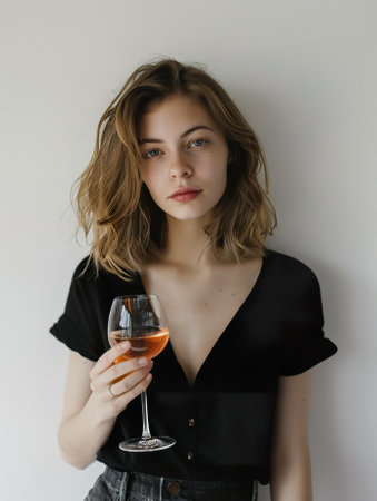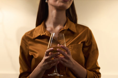 Caucasian young adult woman holding wine glass with both hands, standing against plain background, showing relaxed posture and subtle smile, face partially visible