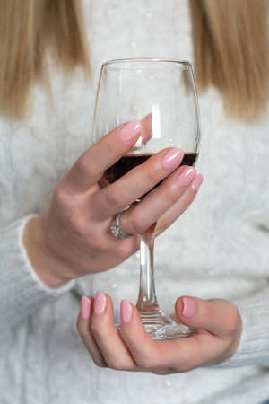 Young girl with baby pink color nails polish gel holding wine glass. Manicure and beauty concept. Close up, selective focus