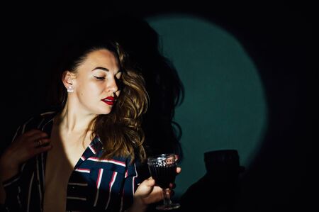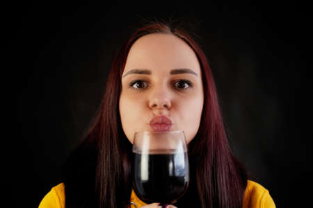 Relaxed young woman poses with glass of red wine on black background. Adult happy brunette resting with alcohol in her weekend
