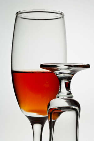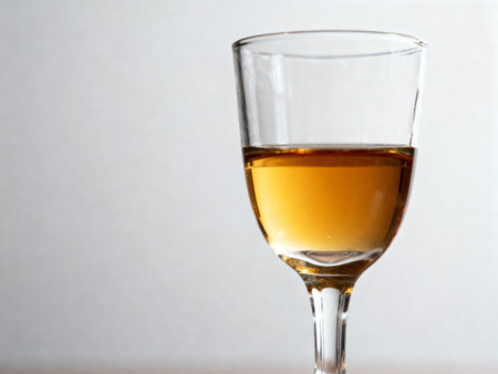 Clear wine glass filled halfway with amber colored liquid, standing against a plain light background in minimalistic composition.