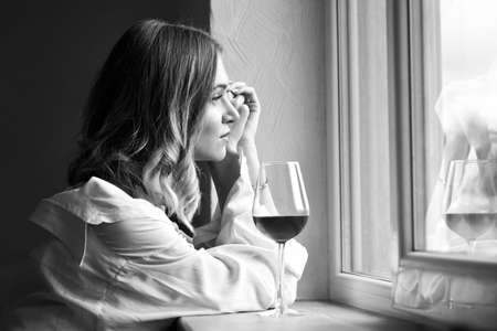 Beautiful young girl with a glass of wine sits near the window. Black and white photo.