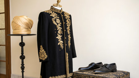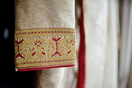 Closeup of traditional indian sherwani with intricate golden embroidery on fabric