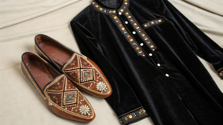 This exquisite velvet jacket showcases intricate floral embroidery and ornate button closures, perfect for highlighting traditional fashion in cultural settings.