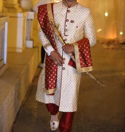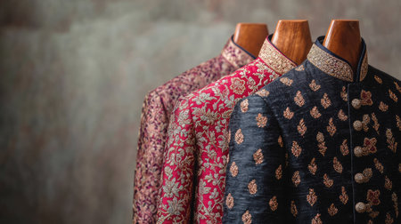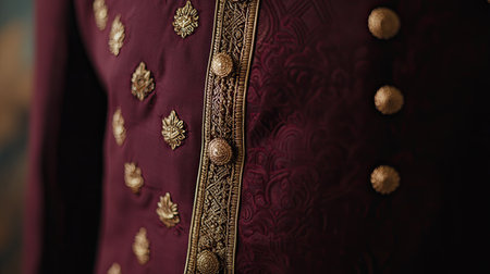 Closeup of traditional indian sherwani, a luxurious and elegant attire crafted with intricate embroidery and exquisite handwork, perfect for weddings and ceremonial festivities