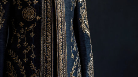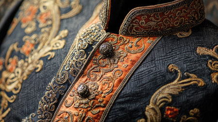 This close-up showcases exquisite embroidery on vintage fabric, featuring rich floral patterns and elegant gold buttons, highlighting craftsmanship and artistry.