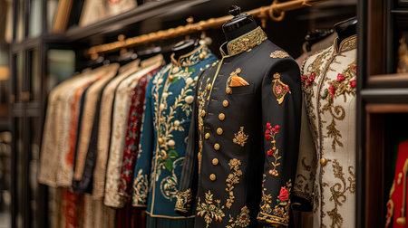 A stunning display of traditional garments featuring intricate embroidery and vibrant colors, capturing the beauty of cultural heritage and textile craftsmanship in an elegant boutique setting.