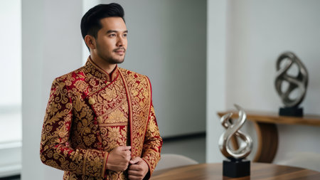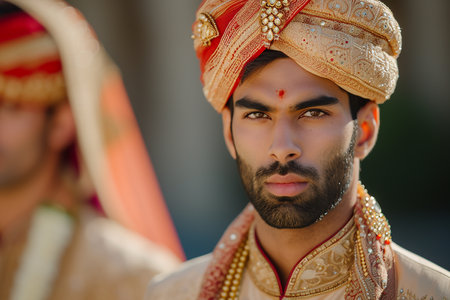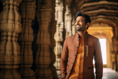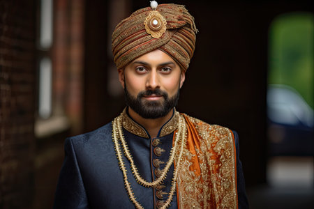 A portrait of an elegant man dressed in traditional Indian attire, showcasing rich colors and intricate details against a warm backdrop, reflecting cultural heritage.