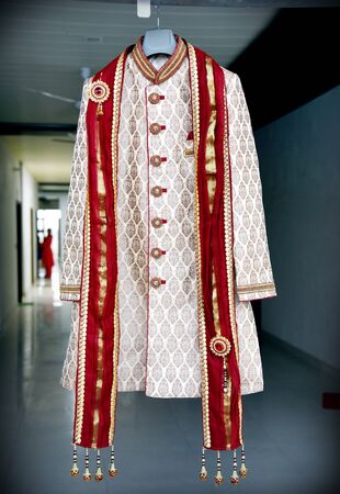 Indian groom's wedding sherwani hanging her ritual ceremony