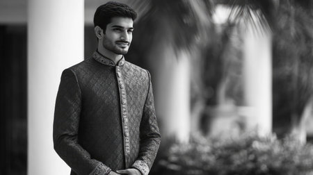 A sophisticated man in traditional attire poses gracefully in an outdoor setting, exuding confidence and elegance in a black-and-white portrait.