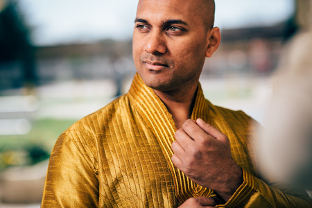 The handsome Indian man wears a gold kurta and posed at a temple.