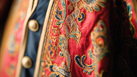 Explore this stunning close-up of an ornate embroidered garment showcasing intricate details, rich textures, and vibrant colors that celebrate traditional craftsmanship.