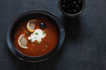 Traditional homemade Russian meat soup Solyanka with black olives and lemon