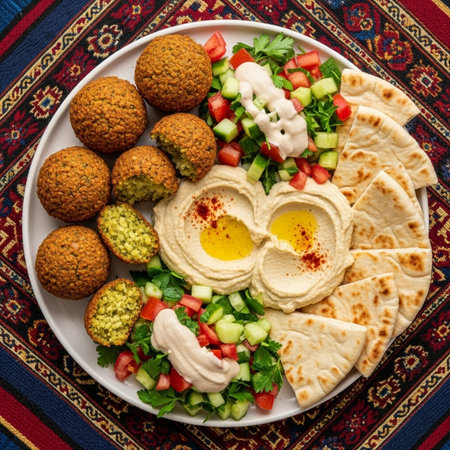 An overhead high-angle shot captures a generous platter of traditional Middle Eastern cuisine. The white plate holds several golden-brown falafel balls, some whole and others cut in half, revealing the vibrant green interior. The centerpiece features a large portion of creamy hummus, artfully swirled and garnished with olive oil and a sprinkle of paprika or sumac. A fresh chopped salad, made with diced cucumber, tomatoes, and parsley, is arranged on the plate, topped with a drizzle of tahini sauce. Slices of warm pita bread are neatly arranged alongside the main components, completing the wholesome vegetarian meal. The platter is set against a backdrop of a colorful, traditional patterned textile.