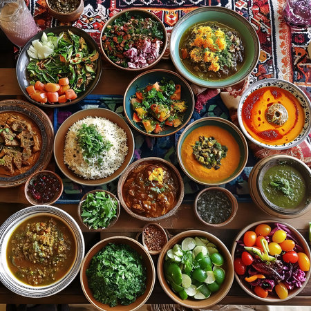 A variety of dishes showcasing different cuisines and ingredients are displayed on the table, highlighting the art of food preparation using natural foods and produce AIG50