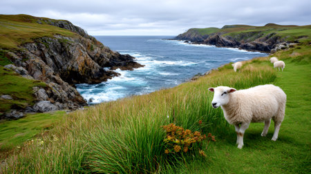Sheep grazing peacefully on a scenic Scottish coastline with crashing waves