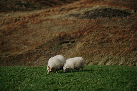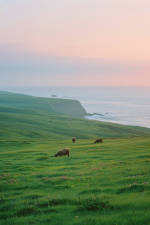 Curious sheep stands in a green meadow, gazing at the distant coastline. Its fluffy white fleece glows in the soft light, surrounded by vibrant vegetation
