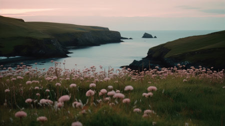 Shoreline covered in pink flowers by the sea. Generaitve AI