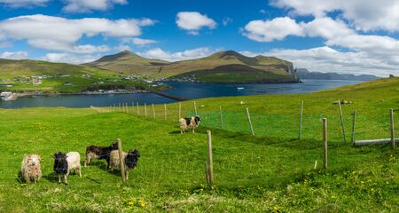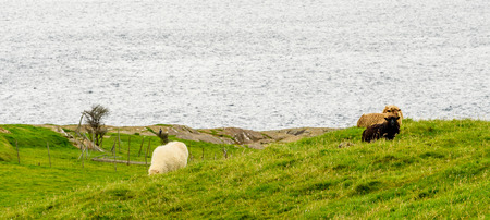 Sheep grazing on Faroe islands coastline. Green scenic landscape. Horizontal