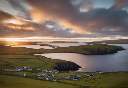 Beautiful landscape with villages & houses & islands in the background, Shetland Islands, Scotland.