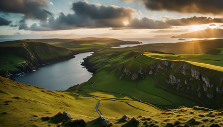 A stunning sunset over the Irish coast, showcasing the dramatic cliffs, green hills and a winding coastline.